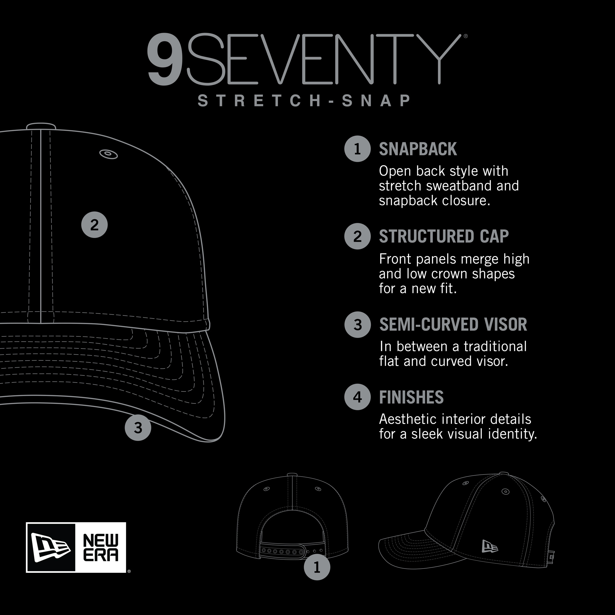 - The 9SEVENTY provides a modern adjustable fit and versatile style with its structured crown, semi-curved visor and performance stretch sweatband