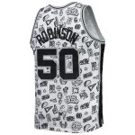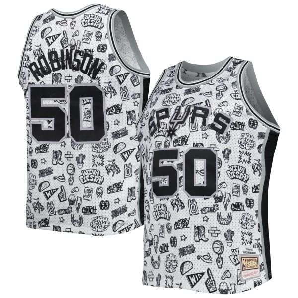 Stand out from the crowd at the next San Antonio Spurs game or watch party by grabbing this 1998/99 David Robinson Hardwood Classics Doodle Swingman jersey by Mitchell & Ness. This jersey highlights one of your all-time favorite players throughout the storied history of your favorite franchise. Complete with tackle-twill San Antonio Spurs graphics, this stylish jersey shows that you’re more than just a casual fan